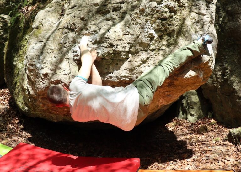 Bouldern am Fels in echter Natur. Lerne Topo-Lesen, Sicherheitstechniken und den respektvollen Umgang mit der Umwelt.
