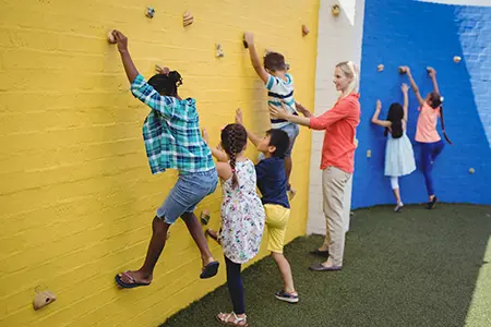 Dabei übernehmen unsere Trainer den fachlichen Bereich des Trainings oder kommen zu Euch an die Schule, um an der hauseigenen Kletterwand den Kindern Technik zu vermitteln.